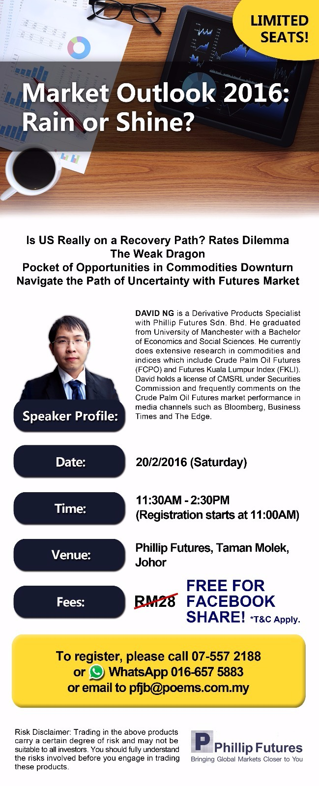 | Saya tidak dapat menghadiri seminar tersebut kerana masih dalam Tahun Baru Cina. Tapi jika anda ingin hadir, silalah pergi ke Phillip Futures cawangan Taman Molek (di antara KFC dan Alliance Bank, depan Petronas). Jika rakan sekerja saya tanya tentang introducer, beritahu aje Teo Soon Ann. | 可惜我不能出席这场讲座会,因为还在过年啊。如果你有兴趣出席的话,不妨到辉立期货百合花园分行(KFC及Alliance银行中间,Petronas油站对面)。若我的同事问起介绍人,就说是Teo Soon Ann吧。 | A bit pity I can't attend the seminar because it is still in Chinese New Year. But if you are interested, do drop by Phillip Futures Taman Molek (in between KFC and Alliance Bank, just opposite Petronas). If my colleagues asked about introducer, just mentioned Teo Soon Ann. |